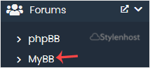 4. On the left side, locate the Forums category. Click on it and then on the MyBB link that appears.