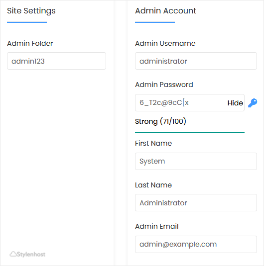 • Admin Username: Your new OctoberCMS username (for security reasons, do not use the administrator or the admin username).